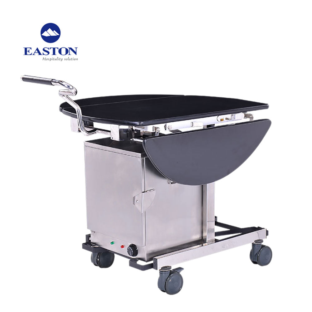 Structura din otel inoxidabil cu finisaj periat si blat rotund MDF cu finisaj negru mat, design pliant si roti pentru deplasare usoara. Dimensiuni: 1070 × 910 × 745 mm.