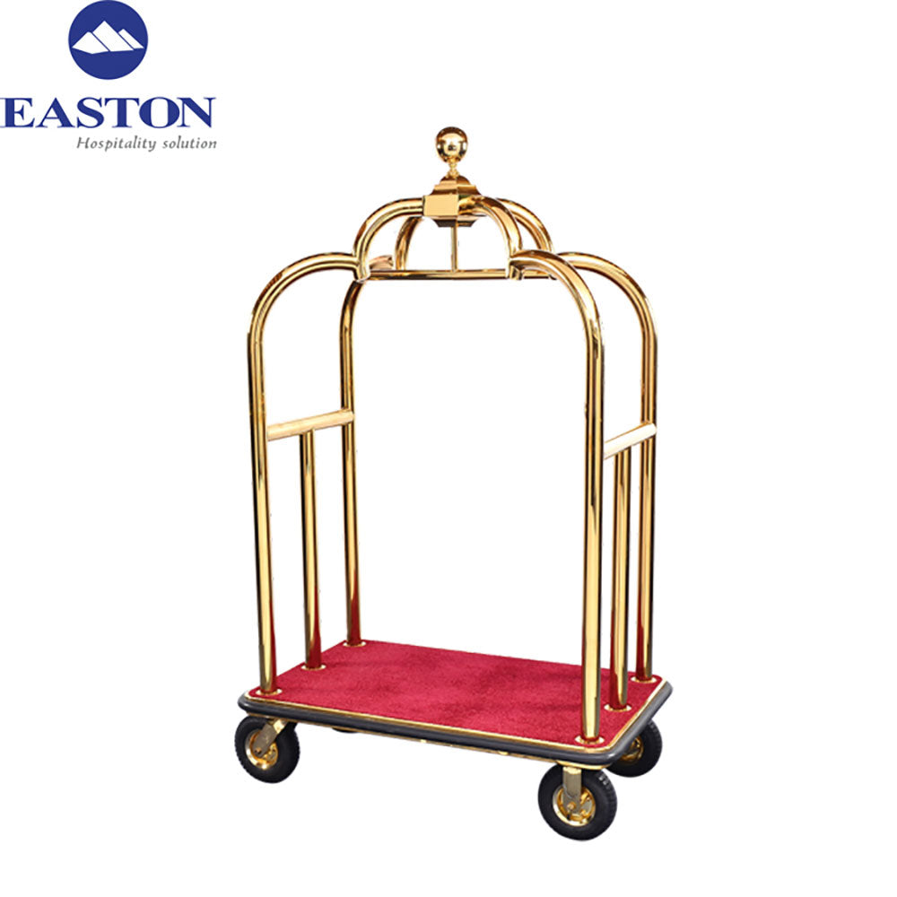 Carucior hotelier din inox gold chrome cu covoras rosu, inaltime 1.900 mm