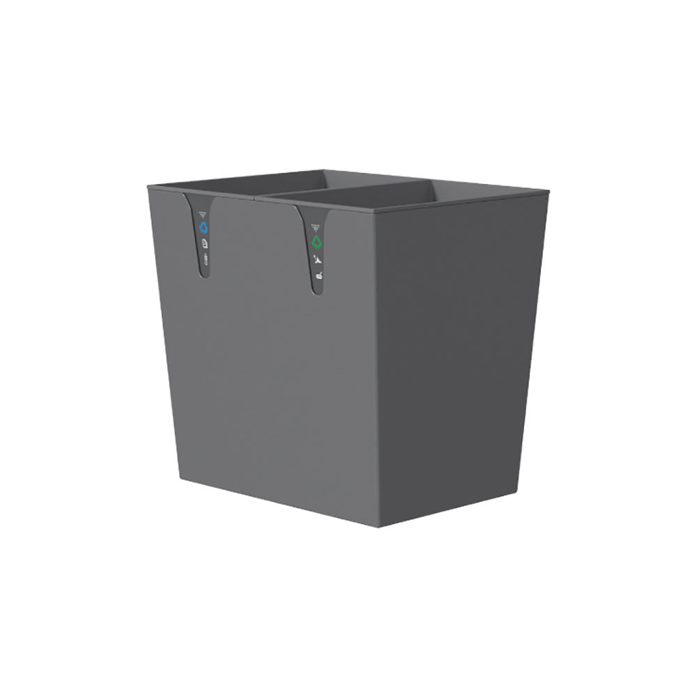 Cos de gunoi cu doua compartimente de cate 8 L, corp metalic vopsit electrostatic si liner interior ignifug si impermeabil. Prevazut cu suport antialunecare L-shape pentru stabilitate.