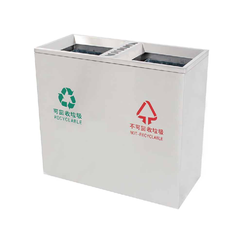Acest cos de gunoi dublu rectangular asigura o gestionare eficienta si ordonata a deseurilor, prin compartimente separate pentru reciclabil si nereciclabil. Realizat din otel inoxidabil cu finisaj periat, dispune de liner interior galvanizat si capac cu doua deschideri usor accesibile, marcate clar prin semnalistica silkscreen.