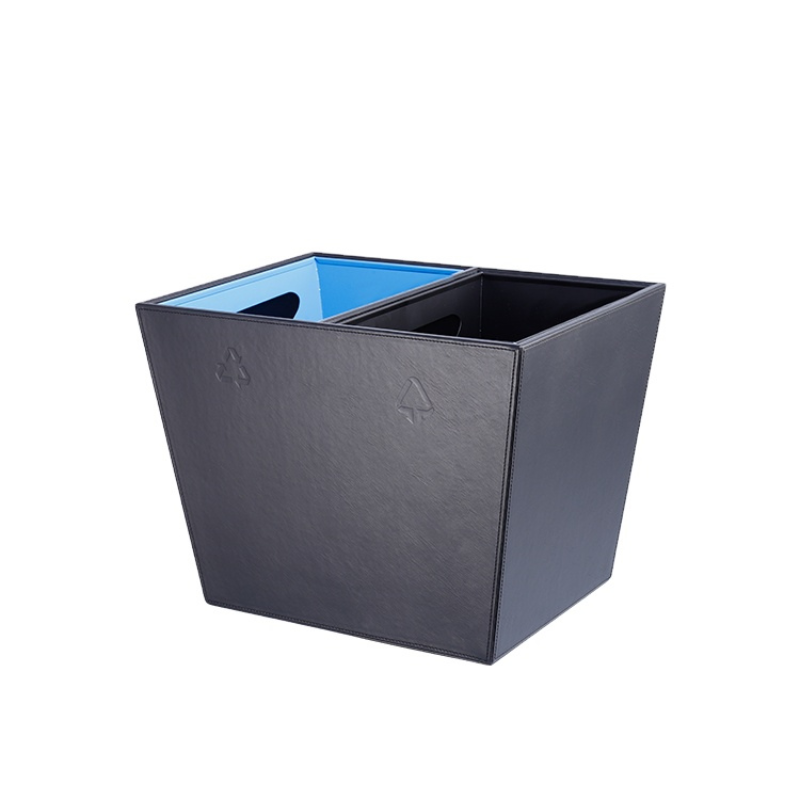 Cos de gunoi cu doua compartimente, imbracat in leatherette negru si liner interior metalic ignifug. Baza cu picioruse de cauciuc pentru stabilitate si protectia pardoselii.