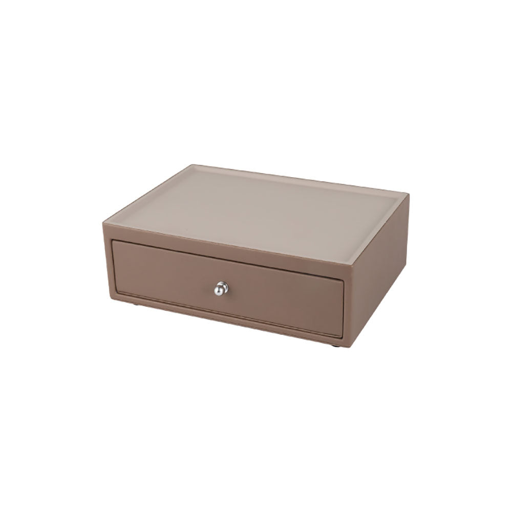 Cutie eleganta cu sertar, pentru depozitarea accesoriilor hoteliere. Dimensiuni: 265 × 195 × 85 mm. Finisaj maro rafinat.