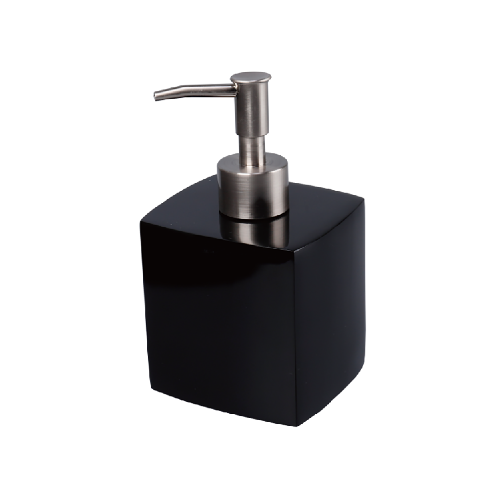 Pompita ergonomica integrata intr-un recipient negru lucios, ideala pentru distribuirea precisa a sapunului lichid sau a lotiunilor de maini. Dimensiuni: 90 × 80 × 90 mm.
