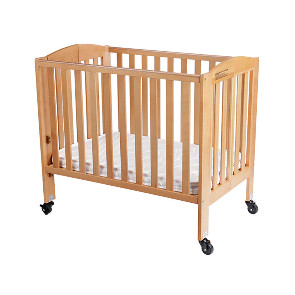 Patut cu structura integrata din lemn cu finisaj natural, saltea de 6 cm grosime si 4 roti de 2,5" cu sistem de blocare. Design ergonomic cu bare arcuite si pliere rapida pentru depozitare.