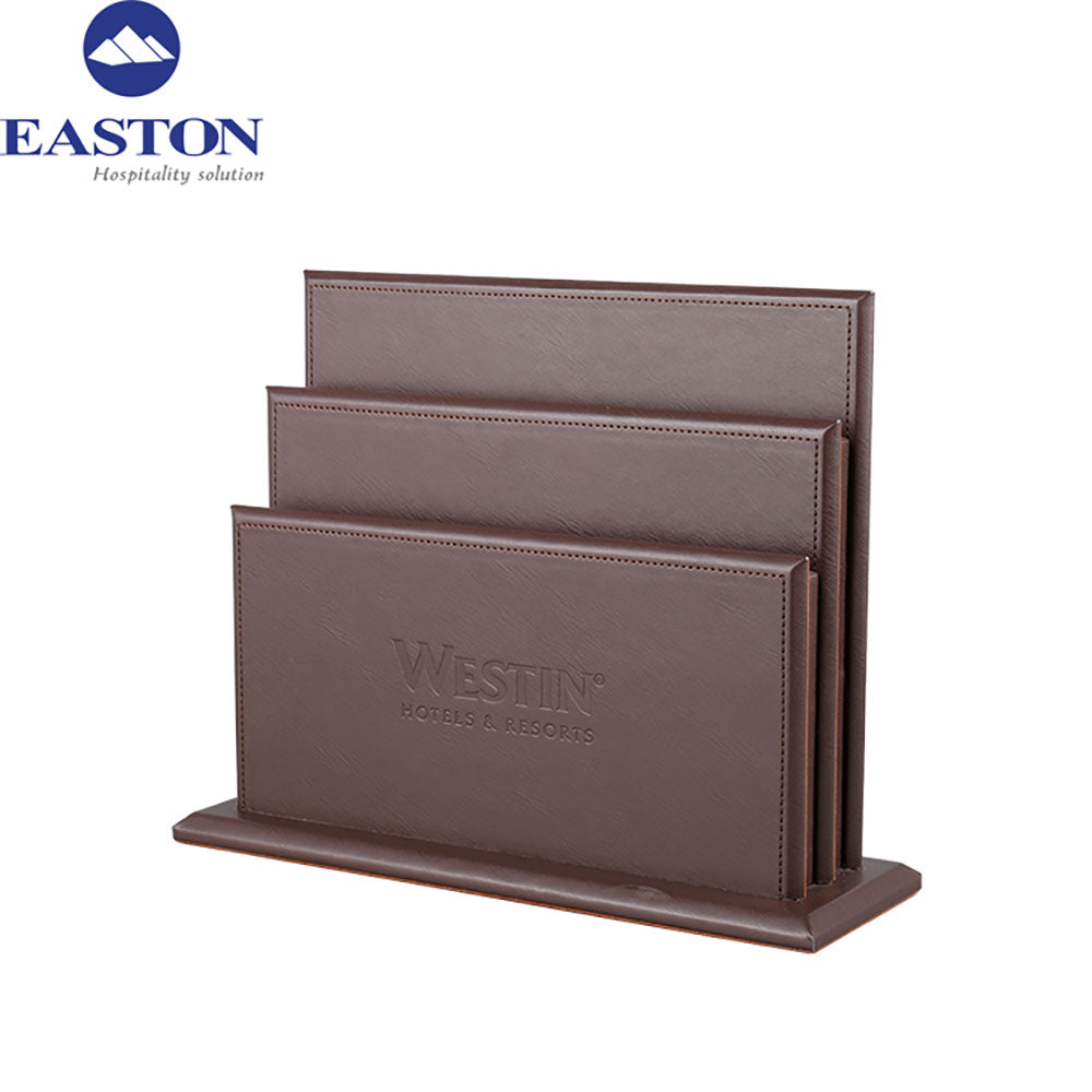 Suportul pentru brosuri este confectionat din piele ecologica in culoarea coffee si este prevazut cu trei compartimente de inaltimi diferite pentru a gazdui brosuri, plianturi, meniuri sau documente informative. Designul sau compact permite amplasarea pe birouri, receptii sau mesele din camerele de hotel, oferind o prezentare clara si organizata a materialelor de promovare sau informare.