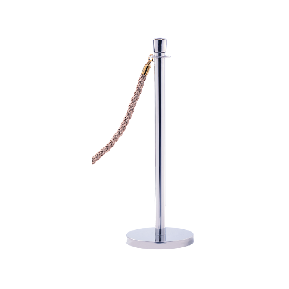 Stalp elegant din inox periat cu tub Ø70 mm si baza rotunda Ø360 mm, dotat cu franghie textila impletita bej, lungime aproximativa 2 m. Dimensiuni: Ø70 × Ø360 × H1050 mm.