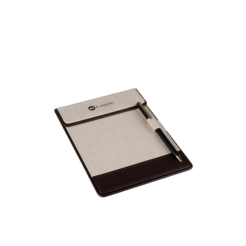 Suportul pentru notite este realizat din piele ecologica, combinand partea superioara ivory cu baza coffee. Cu dimensiuni compacte (130 × 180 mm), ofera spatiu pentru blocnotes si are un suport special pentru pix, fiind potrivit pentru birouri, sali de conferinta si camere hoteliere. Designul sau simplu si rafinat il face un accesoriu elegant si practic.