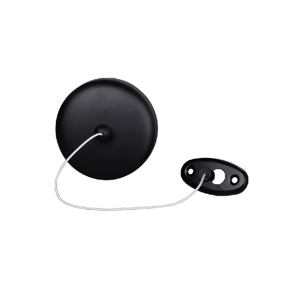 Dispozitiv retractabil cu sfoara rotunda, finisaj negru mat, dimensiuni montaj Ø92×H35 mm.