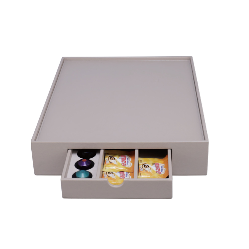 Tava spatioasa din piele ecologica gri, cu finisaj elegant si sertar frontal, ideala pentru prezentarea unui set de ceai sau cafea. Dimensiuni: 300 × 400 × 90 mm.